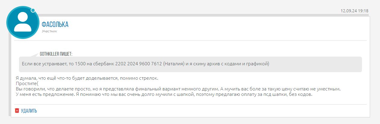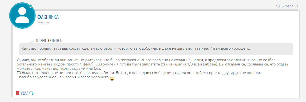 Это учитывая, что человек неделями пытался и пытался, скидывал вам варианты, согласовывал и т.д. Он эти 1,5к честно отработал! Даже если результат не супер-пупер, сугубо на ваш взгляд.