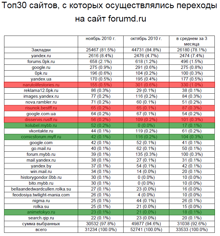 Всего в статистику попадает 30 сайтов, с которых осуществлялись наибольшее количество переходов. Среди них мы находим всех партнеров ForumDesign TS и выбираем трех самых активных.
