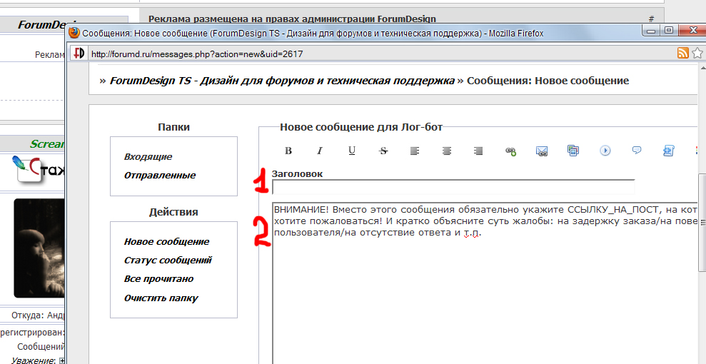 Сообщения с напоминаниями о себе в темах заказов и постоянные крики о помощи в разделах тех.помощи - дизайнерам и модерам форума очень не желательны. Посторонние сообщения и жалобы в темах заказов или тех.поддержки провоцируют задержки в ответе.