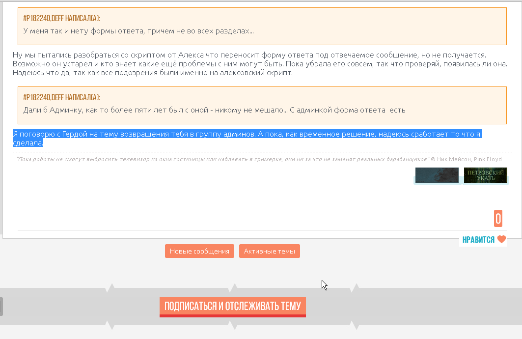 Выдавать админку всем кто пожалуется на отсутствие формы ответа в некоторых разделах - это неадекватное решение, но другого выхода я не вижу, потому что наши в курсе жалобы, но никто не смог понять на все 100 в чём дело, грешили на скрипт что я убрала (сейчас верну его).
