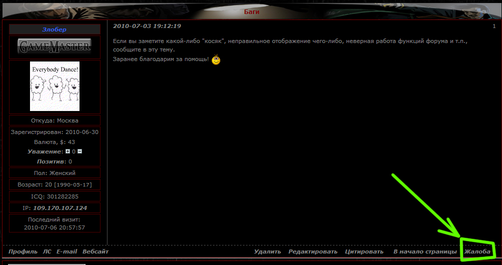 sadhaka написал(а):Может сделать кнопку "Пожаловаться"? Чтобы при возможности люди могли тынкуть на нее, чем сообщить админу о каких-то нарушениях?