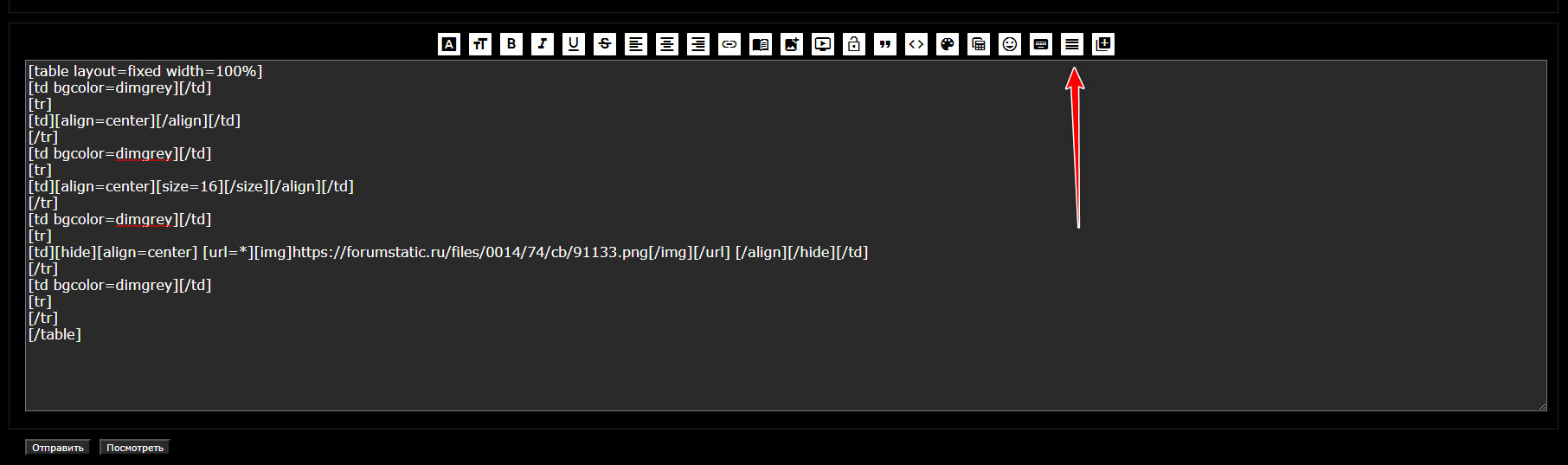 [table layout=fixed width=100%] [td bgcolor=dimgrey][/td] [tr] [td][align=center][/align][/td] [/tr] [td bgcolor=dimgrey][/td] [tr] [td][align=center][size=16][cursor][/size][/align][/td] [/tr] [td bgcolor=dimgrey][/td] [tr] [td][hide][align=center] [url=*][img]https://forumstatic.ru/files/0014/74/cb/91133.png[/img][/url] [/align][/hide][/td][/align][/hide][/td] [/tr] [td bgcolor=dimgrey][/td] [tr] [/tr] [/table]