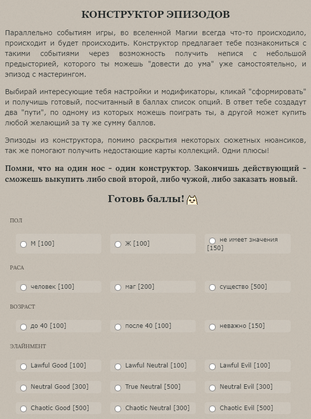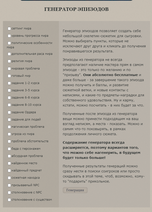 К сожалению, предлагаемые рандомалом опции не все подходили нам для генерации мини-сюжета: из-за лорных нюансов, некоторые варианты получались не слишком подходящими для отдельных групп персонажей, нельзя было какие-то штуки НЕ генерировать, само наполнение генератора было неудобным + внешний вид и сторонний сайт, всё-таки, не для всех комфортная история.