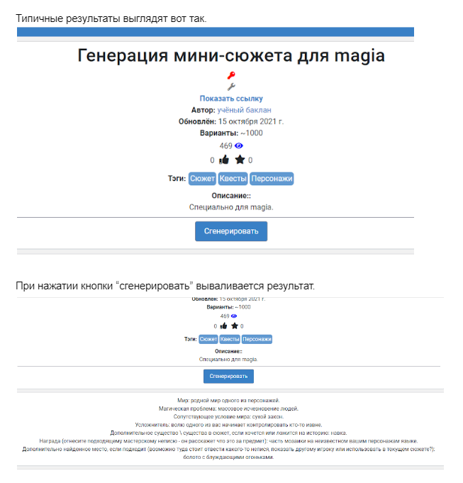 Для нас, админов, есть спец-панель, в которой мы всем АМС составом можем добавлять новые фичи в генератор, причём даже достаточно объёмные. Я это всё сама описывала для Фимочки, чтобы мы максимально поняли друг друга. Получилось очень замурчательно, поскольку в генераторе даже предусмотрена фича с отключением некоторых вариантов генерации: например, можно сделать временные варианты под какой-нибудь сезон или ивент. Кайф в том, что при всей автономии, которую получают игроки при использовании генератора, с моей стороны, как мастера, всё же есть и процент участия, и комфортная доля контроля: т.к. я заполняю варианты генерируемого контента, результат не будет идти вразрез с лором игры, игроки не получат бессмысленное слоняние в эпизод и, при этом, не зависят от меня и моего участия в их сыгровке, оставаясь в рамках игровой вселенной и контекста отыгранных сюжетов.